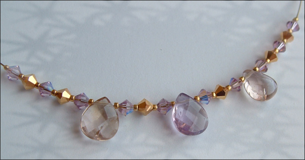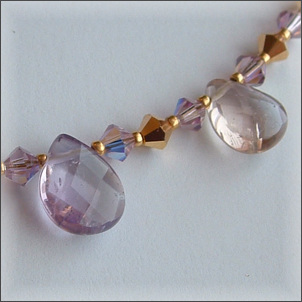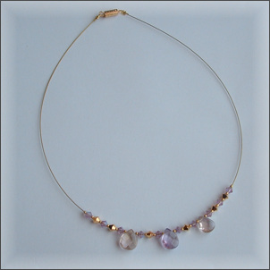 Composition : 3 amétrines* véritables, cristal Swarovski© dont 6 toupies dorées à l'or fin, fil câblé doré