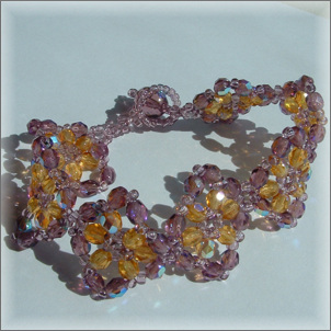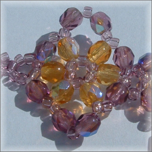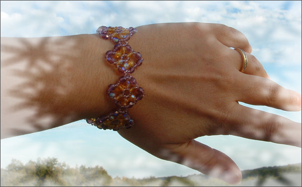 Composition : cristal de Bohême à reflet Aurore Boréale©, couleurs améthyste et topaze, mini rocailles