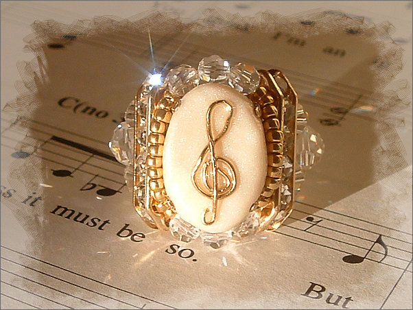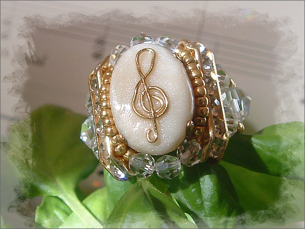 Composition : cristal Swarovski© et de Bohême, cabochon en pâte polymère nacrée (incrustée d'une clef de sol façonnée avec du fil de laiton), rocailles dorées
