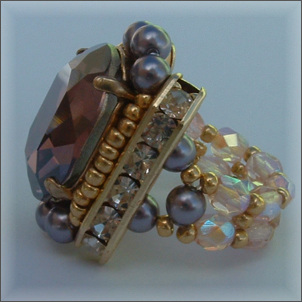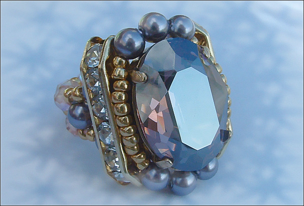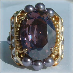 Composition : cristal Swarovski© dont 1 gros cabochon ovale serti, barrettes strass, perles nacrées, cristal de Bohême, rocailles dorées