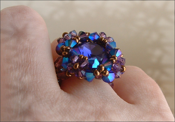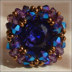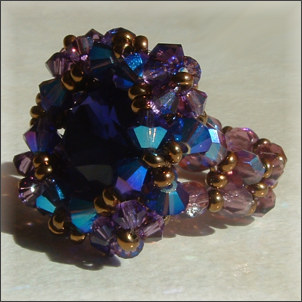 Composition : cristal Swarovski© (Purple Velvet AB2X, Amethyst...) dont un cabochon, cristal de Bohême, rocailles bronze