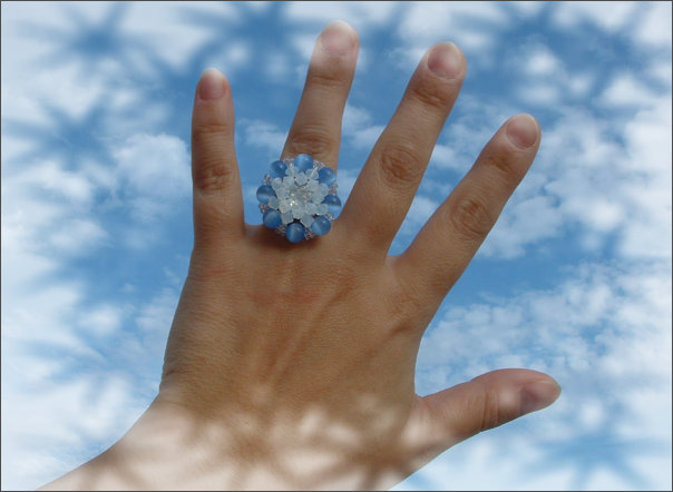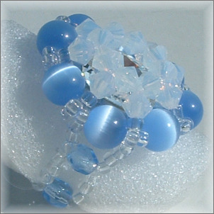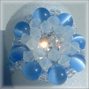 Composition : cristal Swarovski© dont un cabochon Cristal de 12 mm (au centre), cristal de Bohême, yeux de chat, mini rocailles