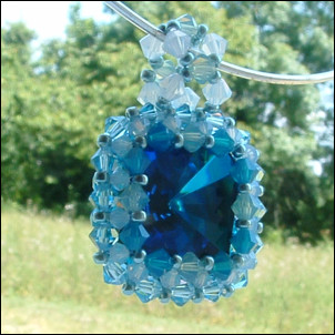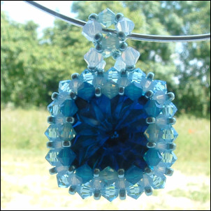 Composition : magnifique rivoli plat Swarovski© Vintage "Bermuda Blue" de 18 mm, serti de toupies cristal (Caribbean Blue, Pacific Opal, White Opal, Aquamarine), cristal de Bohême, rocailles métal bleu argent