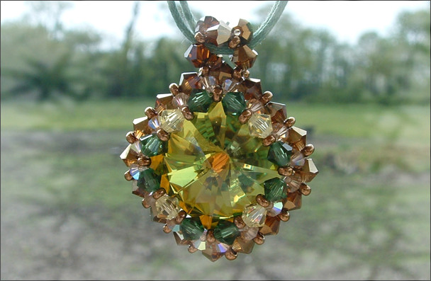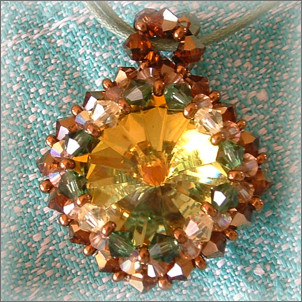 Composition : rivoli Swarovski© Vintage "Sahara" (très rare) de 18 mm, serti de toupies cristal (jaune, vert, chocolat...), cristal de Bohême, rocailles bronze