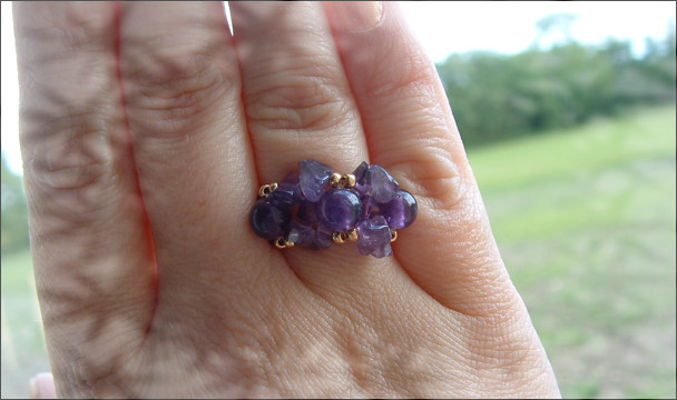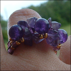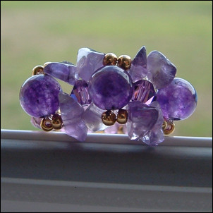 Composition : cristal Swarovski©, rondes et chips en améthyste véritable, cristal de Bohême, rocailles dorées