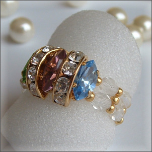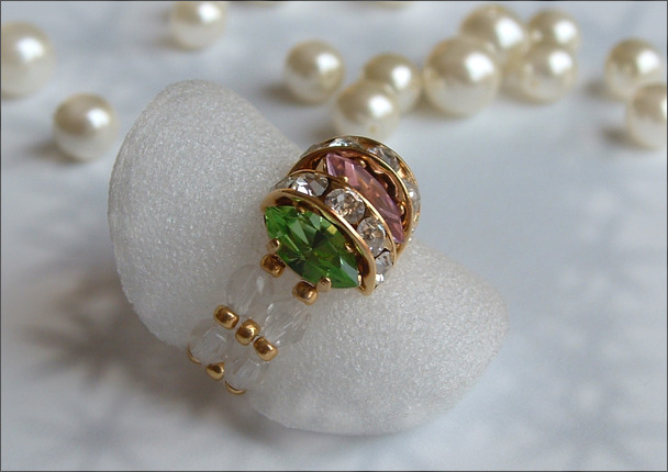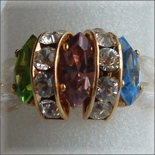 Composition : cristal Swarovski© dont 3 navettes serties (Peridot, Light Amethyst et Light Sapphire), demi-lunes strass, cristal de Bohême, rocailles dorées