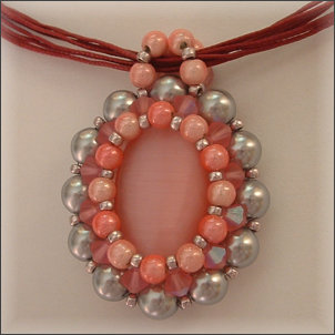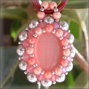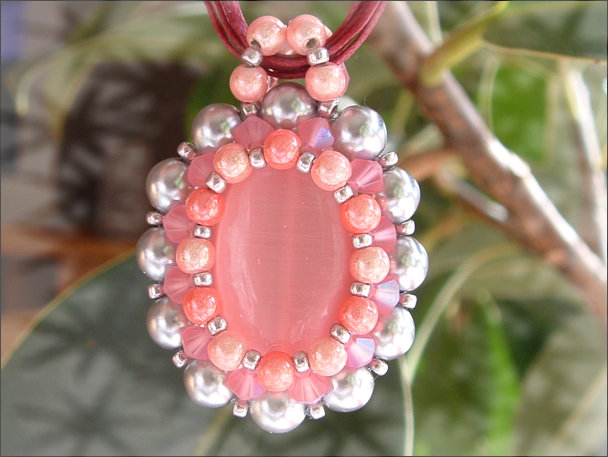 Composition : cristal Swarovski©, perles miracle, perles nacrées argentées, 1 grosse perle oeil-de-chat au centre, rocailles argentées