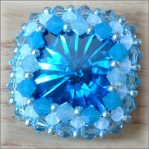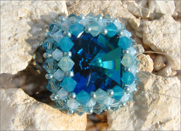 Composition : magnifique rivoli plat Swarovski© Vintage "Bermuda Blue" de 18 mm, serti de toupies cristal (Caribbean Blue, Pacific Opal, White Opal, Aquamarine), cristal de Bohême, rocailles métal bleu argent