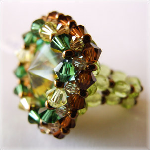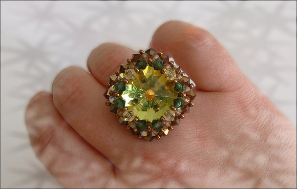 Composition : merveilleux rivoli Swarovski© Vintage "Sahara" (très rare) de 18 mm, serti de toupies cristal (jaune, vert, chocolat...), cristal de Bohême, rocailles bronze