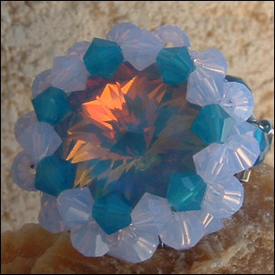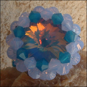 Composition : envoûtant rivoli Vintage Swarovski© Ultra-Light Blue (rarissime couleur bleue turquoise tirant sur le rose/saumon), serti de cristal (Caribbean Blue Opal et Violet Opal)
