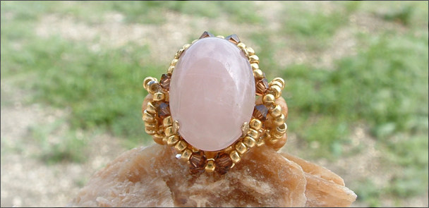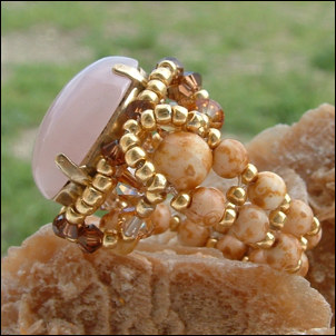 Composition : cristal Swarovski©, quartz rose véritable, rondes marbrées en verre, rocailles dorées