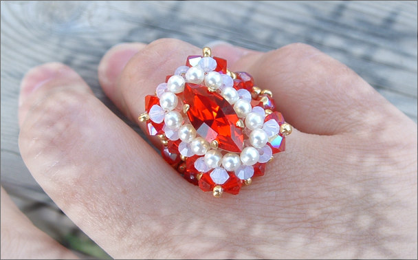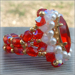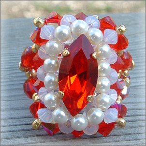 Composition : cristal Swarovski© dont 1 navette sertie, boules nacrées, cristal de Bohême, mini rocailles dorées