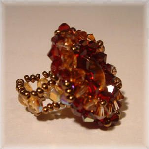 Composition : cristal Swarovski© (tons topaze, siam, copper) dont un cabochon larme, cristal de Bohême, rocailles bronze